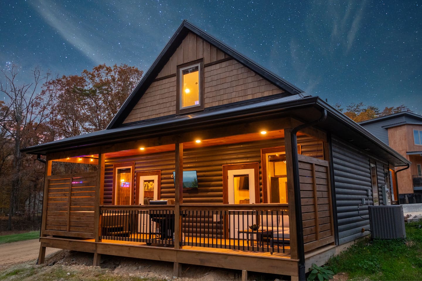 On the front porch, you’ll find a cozy spot for morning coffee or evening conversations, complete with comfortable seating and warm cabin charm.