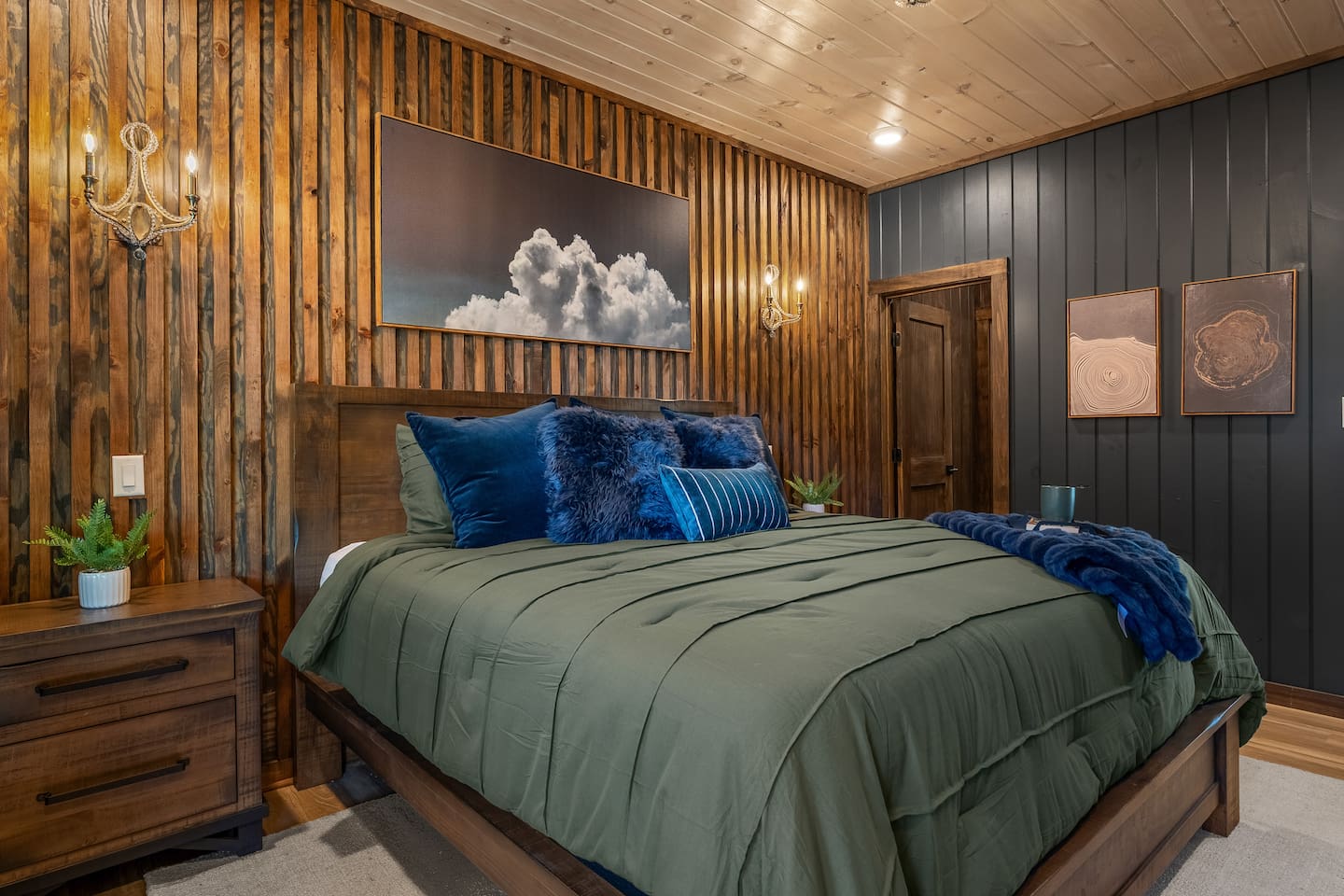 Rich tones, comfortable bedding, and an ensuite bathroom create a calming retreat for rest and privacy.