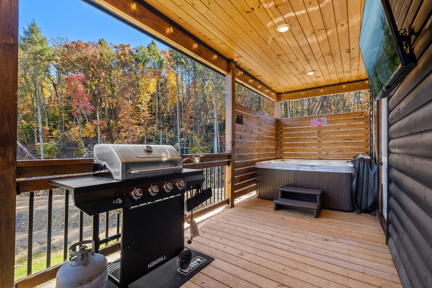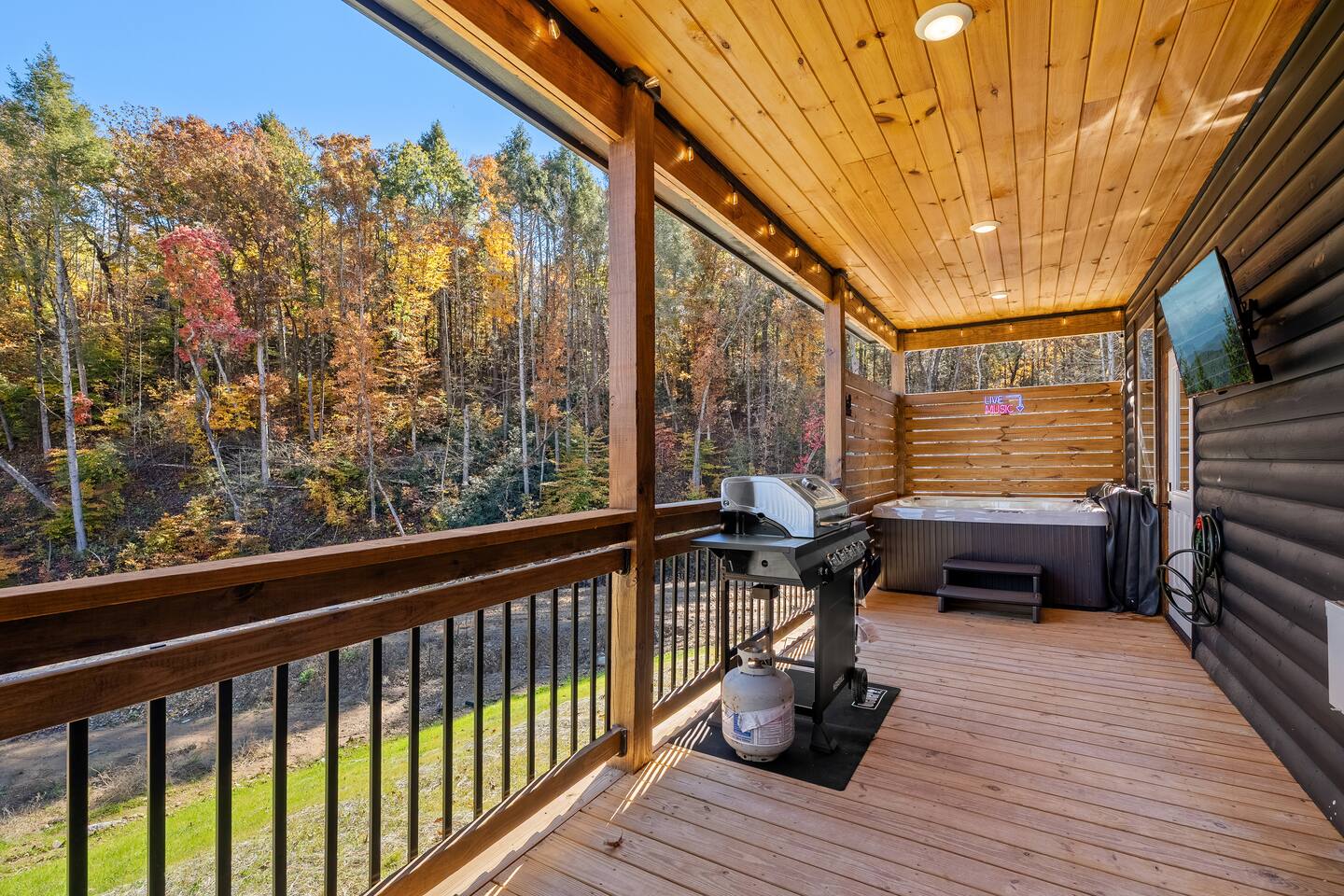 Step outside to the back porch, where comfort meets mountain air. Relax in the private hot tub, watch a game or movie on the outdoor TV, or enjoy dinner outside with the grill and outdoor dining space. It’s peaceful, private, and perfect year-round.