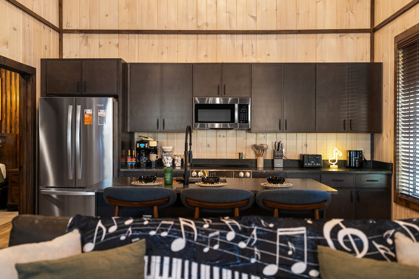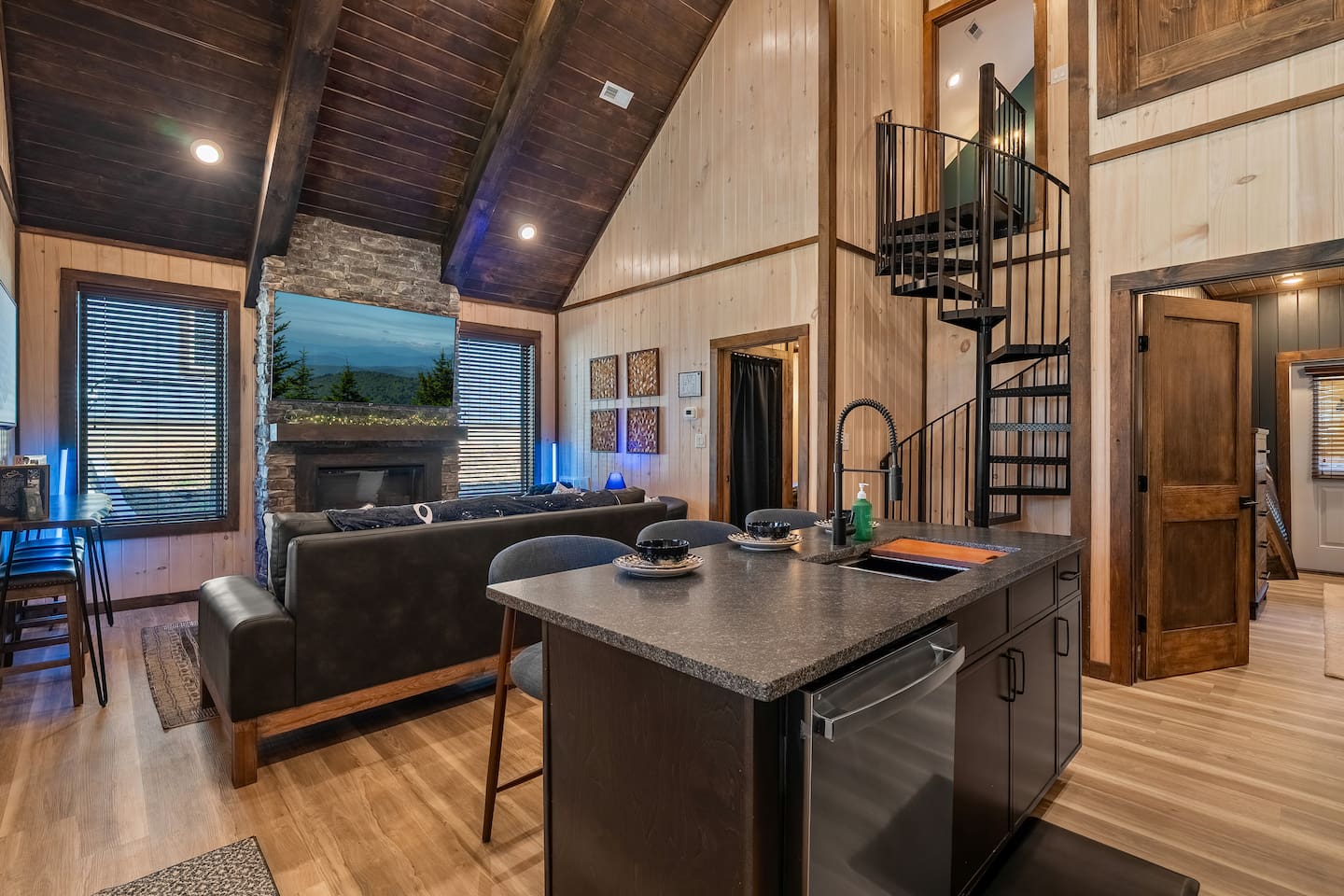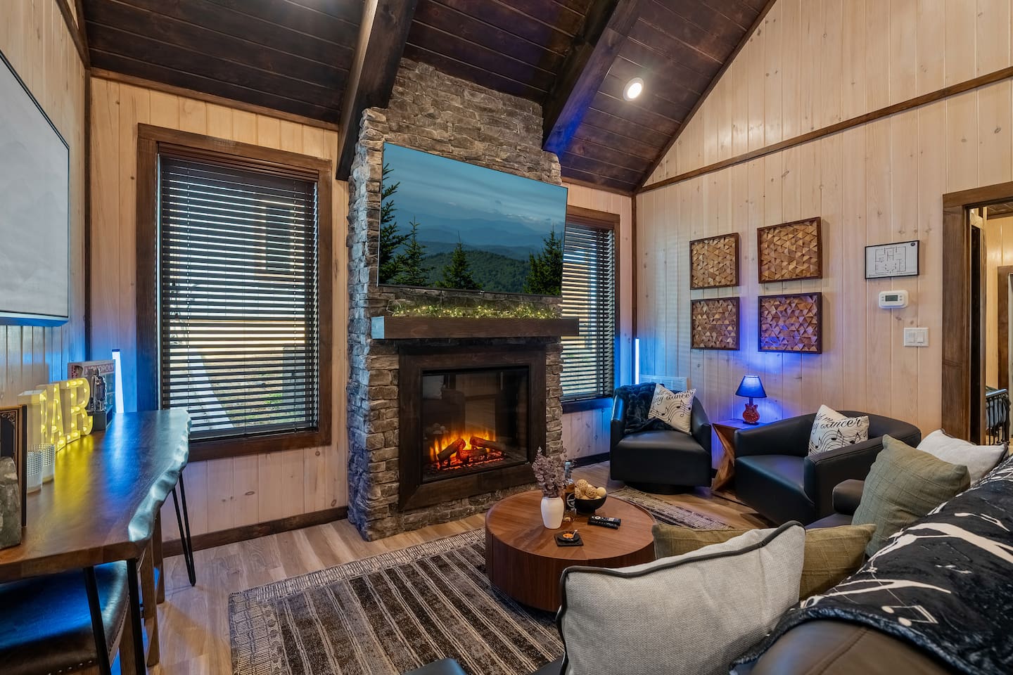 Step into the heart of the cabin where comfort meets luxury. The living room features a warm electric fireplace surrounded by rich décor accents, plush seating, and soft blankets for movie nights or slow mornings. A stylish beverage area makes it easy to relax with wine, cocktails, or coffee. The fully stocked kitchen is perfect for cooking meals, baking treats, or enjoying a cozy dinner together—with elegant touches and warm wood tones that make the space feel upscale and inviting.