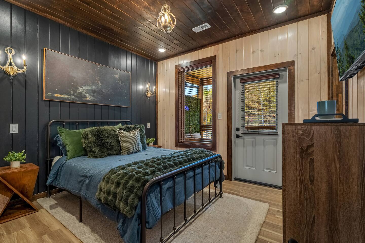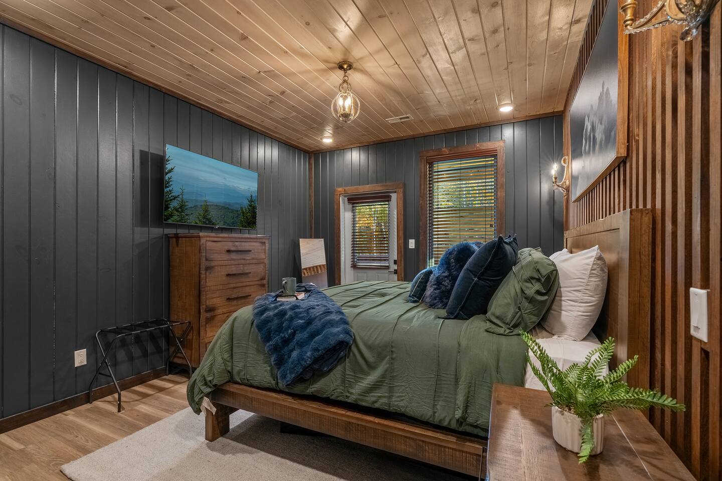 This luxurious primary suite offers warm lighting, a cozy king bed, elegant décor, a full dresser, and a large mirror perfect for getting ready. It’s a peaceful, refined space designed for comfort and relaxation.